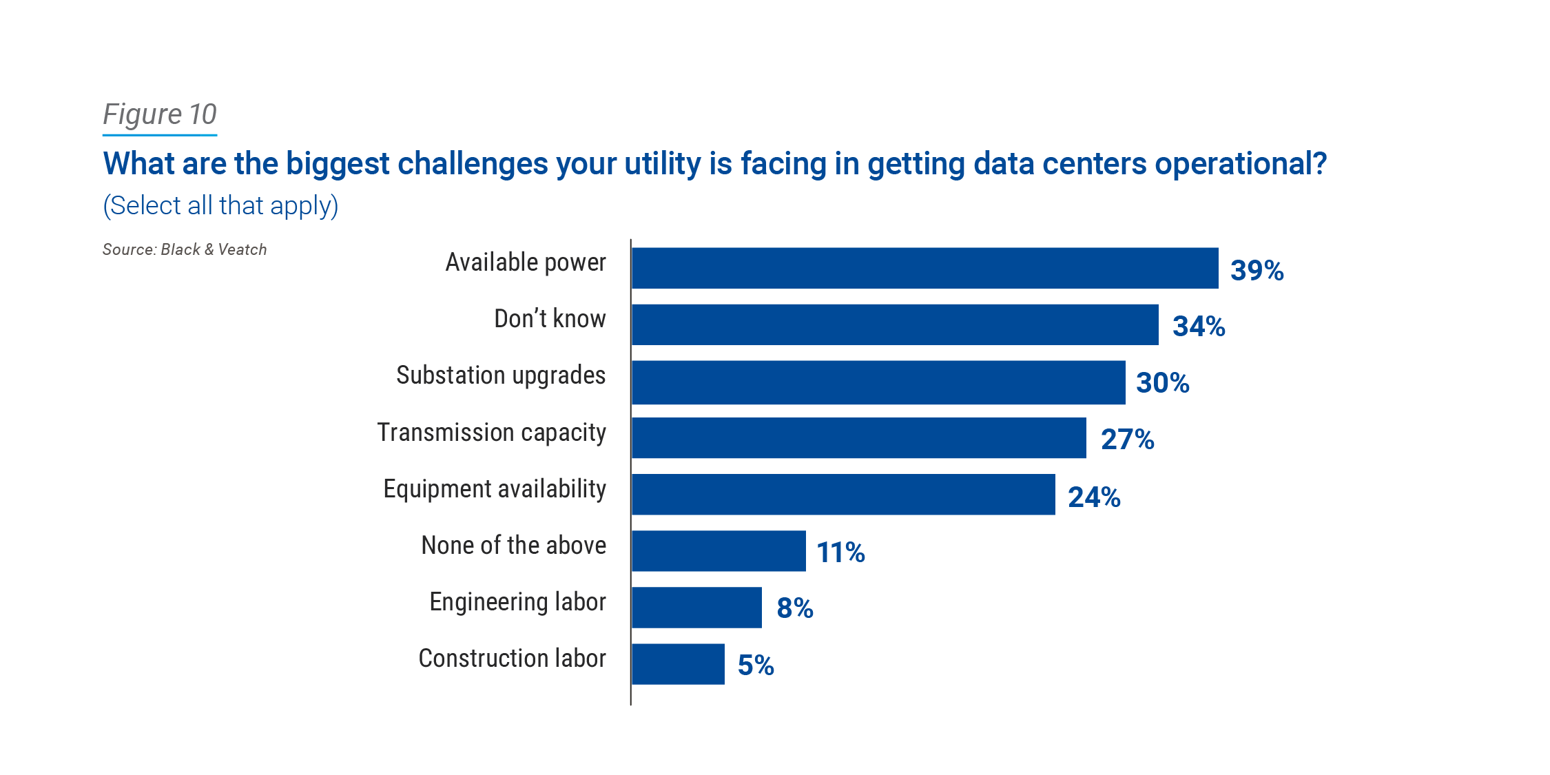 In looking at the biggest challenges utilities face in getting data centers operational, nearly four in 10 (39 percent) cited available power while 30 percent pointed to necessary substation upgrades. Interestingly, almost one in four (24 percent) stated equipment availability was a major concern (Figure 10). In many cases, the wait times for circuit breakers, switchgears, transformers and gas turbines could be three years or more, something entities building substations or their own power generation must consider.